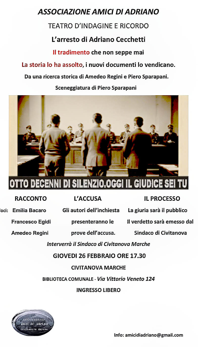 Cecchetti. Il 13/12/97 si è tenuto il grande Convegno “Qui vive ADRIANO CECCHETTI…”: 50 anni dalla morte (1947-1997). ARCHEOLOGIA INDUSTRIALE A CIVITANOVA (15) . All’Iniziativa hanno collaborato moltissime persone che ci tengo a citare (16) sperando di non scordare nessuno. I bei frutti del Congresso sono che, dopo molti solleciti, il 22/7/98 un funzionario della Soprintendenza Archivistica delle Marche (Dott. ssa Cavalcoli) compie un sopralluogo verificando l’importanza dei Disegni e dei Documenti conservati negli uffici della Cecchetti (17) ; quindi il 4 ed il 9 Settembre scorsi, grazie ai soliti volenterosi volontari, si sono messi in salvo al Museo alcuni modelli (18). Infine proprio nel dicembre scorso la Regione ha pubblicato il Catalogo Musei Demoantropologici nelle Marche dove la Sez. Cecchetti-SGI ha visto una delle sue prime citazioni ufficiali. Per il futuro si spera che i contatti (19) intrapresi con il Prof. Luciano Pallottini dell’Archeoclub di Carassai (AP) e con la sezione d’ITALIA NOSTRA di Fermo (AP) continuino come si può ben sperare grazie alla prossima tesi di laurea in architettura ad Ascoli Piceno di Barbara Moschettoni (20). L’ultimissima informazione sull’argomento è la traduzione in inglese del video (21) e la nascita il 17/1/99 dell’Ass. ne Amici del Museo delle Arti e Tradizioni Popolari di Civitanova Marche (22) che valorizzerà sicuramente quanto già fatto a cominciare da questo articolo per Archeopiceno. A tutti appuntamento per il 3^ Convegno nel 2000!